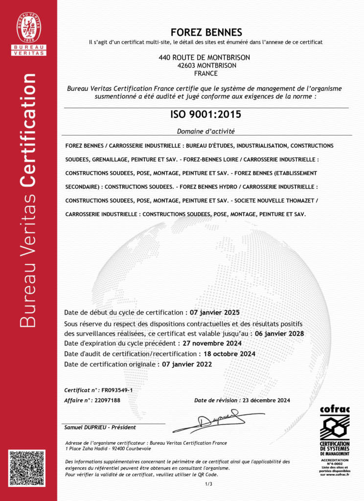 Depuis novembre 2021, Forez-Bennes et les carrosseries Forez-Bennes ont obtenu la certification ISO 9001.
